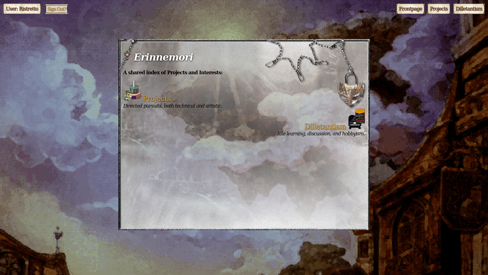 Welcome (again) to Erinnemori, a project catalog and knowledge sharing forum. I hope the website's look and feel can serve as a better introduction than I could do in writing.