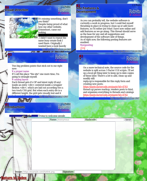 I'm pretty proud of how the CSS turned out and on the technical side the website automatically fetches new posts without any javascript...but it looks like I fucked something up with the HTTP header hack I used to get that to work and it's broken on Chrome. I'm pretty sure that's fixable, but I'm fucking sick of webdev for the minute.